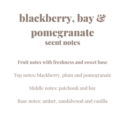 blackberry, bay & pomegranate features rich notes of dark red fruits and berries, and botanical scent of bay leaves combined with a sweet base notes of vanilla.
